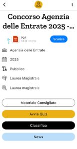 Con un’interfaccia semplice e intuitiva, l’app dà la possibilità di rispondere a un vasto database di domande per prepararsi ai concorsi pubblici. In occasione della prova del concorso dell’Agenzia delle Entrate, Worky ha reso disponibile sull’app anche le materie per esercitarsi in maniera del tutto gratuita (Per scaricare l’app android dal Play Store, clicca qui; Per scaricare l’app dall’Apple Store, clicca qui.).